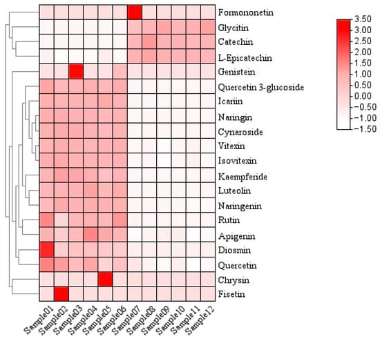 As shown in Figure 8, when the screening conditions were VIP > 1 and p < 0.05, a total of 15 differential flavonoids were screened in the 12 samples, including kaempferide, diosmin, quercetin, quercitrin 3-glucoside, L-epicatechin, catechin, naringenin, rutin, glycitin, icariin, vitexin, isovitexin, luteolin, naringin, and cynaroside. These flavonoids have significant differences between subgroups and are also characteristic flavonoids that deserve our attention.
