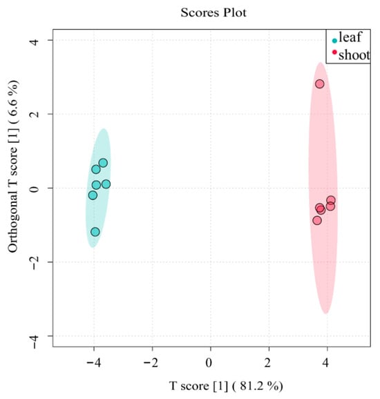 OPLS-DA score chart of flavonoids of P. amarus leaves and shoots. Each point corresponds to one sample, and the horizontal and vertical coordinates are the values of the two factors with the best discriminatory effect (score means the values of the two factors). The different colours represent different groupings, and the area marked by the ellipses is the 95% confidence region.