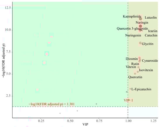 Importance diagram of flavonoids for OPLS-DA. Each point represents a flavonoid compound; the horizontal coordinate is the value of VIP and the vertical coordinate is the FDR-corrected p-value (log10 transformation).