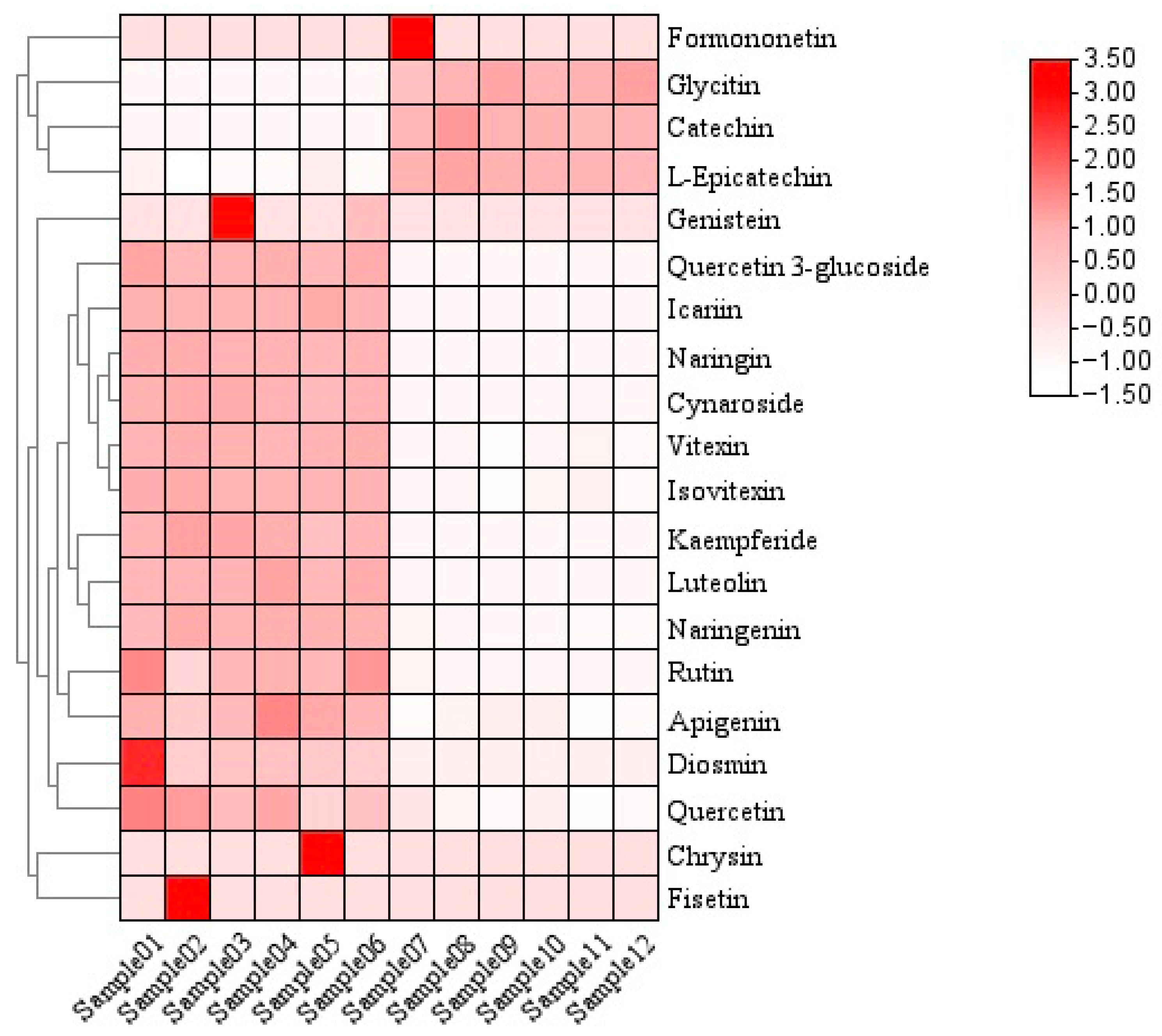 3.3.5. Correlation Analysis of Flavonoids in P. amarus Leaves and Shoots