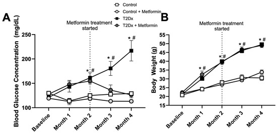 Hyperglycemia was rescued by metformin treatment, without affecting body weight, in obese type 2 diabetic (T2Dx) animals. (A) Mean ± SE of fasted serum blood glucose levels of untreated and treated T2Dx and control groups. (B) Mean ± SE of body weight of untreated and treated T2Dx and control groups. n = 6/group. * p < 0.05 vs. control, # p < 0.05 vs. baseline, via two-way repeated measure ANOVA.