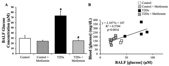 Obese type 2 diabetic (T2Dx) exhibited higher glucose concentration in the airway, which was rescued with metformin treatment. (A) Mean ± SE of glucose concentrations in bronchoalveolar lavage fluid (BALF) of untreated and treated T2Dx and control groups (n = 3–4/group); * p < 0.05 vs. Control, # p < 0.05 vs. Diabetic, via two-way ANOVA. (B) Linear correlation between blood and BAL fluid glucose levels.