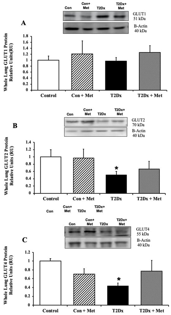 Type 2 diabetes (T2Dx) induced decreased pulmonary protein expression of the class I glucose transporter (GLUT), which was partially rescued by in vivo metformin (Met) treatment. Total protein expression of (A) GLUT1, (B) GLUT2, and (C) GLUT4 in the whole lung of control (con), untreated T2Dx, and metformin-treated T2Dx mice. Top panels: representative Western blot from total lysate of the whole lung; loading control: beta actin. Bottom panels: Mean ± SE of total GLUT protein content (values normalized to β-actin and its respective controls, n = 4–6/group). * p < 0.05 vs. control. Methods: Western blotting.