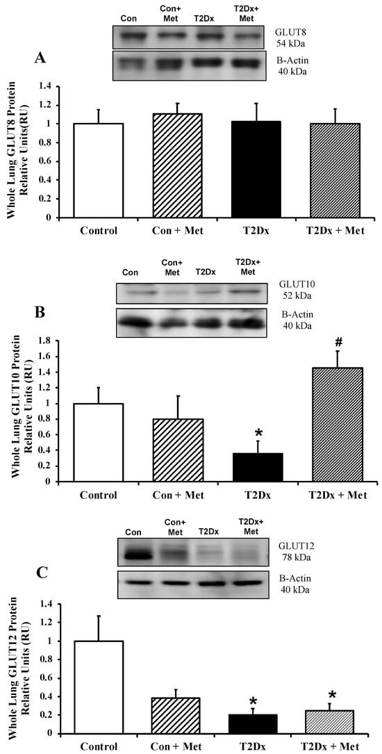 Type 2 diabetes (T2Dx) decreased pulmonary protein expression of the class III glucose transporter (GLUT), which were rescued by in vivo metformin (Met) treatment. Total protein expression of (A) GLUT8, (B) GLUT10, and GLUT12 (C) in the whole lung of control (Con), untreated T2Dx, and metformin-treated T2Dx animals. Top panels: representative Western blot of the class III GLUT and β-actin (loading control). Bottom panels: Mean ± SE of total GLUT protein content (values normalized to β-actin and its respective controls, n = 4–6/group). * p < 0.05 vs. control, # p < 0.05 vs. T2Dx via one-way ANOVA. Methods: Western blotting.