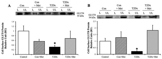 Type 2 diabetes (T2Dx) decreased pulmonary cell surface glucose transporter (GLUT) protein expression, which was rescued by in vivo metformin (Met) treatment. Cell-surface protein expression of (A) GLUT4 and (B) GLUT8 in whole lung of control (Con), untreated T2Dx, and metformin-treated T2Dx animals. Top panels: representative Western blot. Bottom panels: Mean ± SE of cell surface GLUT protein content (values normalized to respective controls, n = 4/group). L: Labeled (cell surface fraction), UL: unlabeled (intracellular fraction). * p < 0.05 vs. control, via one-way ANOVA. Methods: biotinylated photolabeling assay.