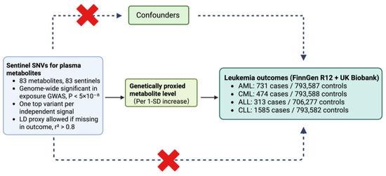Recent metabolite GWAS have created a robust “instrument library” for MR. For example, a 2023 Nature Genetics study reported association signals for 1091 plasma metabolites and 309 biologically constrained ratios, mapping the genetic architecture of the plasma metabolome and linking it to complex traits. Earlier work had already charted genetic influences on more than 400 blood metabolites [9,10]. These public resources make two-sample MR with metabolite exposures feasible by harmonizing genome-wide significant metabolite instruments with leukemia GWAS outcomes to estimate causal effects.