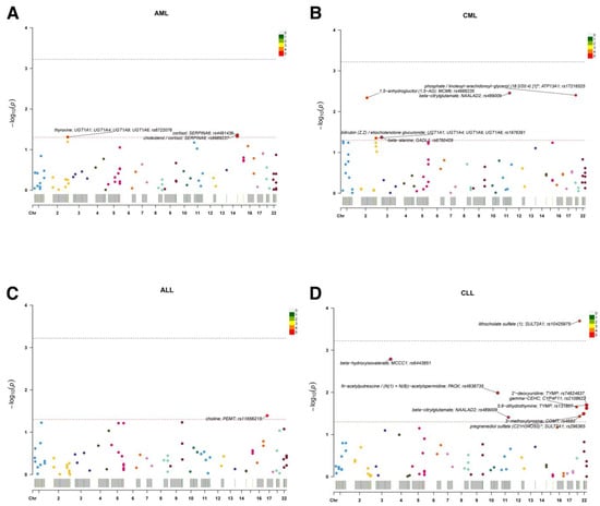 Single-sentinel MR scans of plasma metabolites by leukemia subtype. (A) AML, (B) CML, (C) ALL, and (D) CLL. Each point is one metabolite–outcome test using the metabolite’s sentinel SNV; the x-axis places the sentinel by chromosome, and the y-axis shows −log10(P). Labels mark the top signals (metabolite; annotated gene; sentinel rsID). The upper dashed line denotes the significance (α = 0.05/83); the lower dashed line denotes suggestive significance (p = 0.05). A significant association is observed for lithocholate sulfate (1) in panel D (CLL); other panels display suggestive signals only. An asterisk indicates that metabolite unit: 1 s.d. of log-normalized values and metabolite ratio unit: 1 s.d. of inverse rank normalized values. ALL, acute lymphoblastic leukemia; AML, acute myeloid leukemia; CLL, chronic lymphocytic leukemia; CML, chronic myeloid leukemia; MR, Mendelian randomization; SNV, single-nucleotide variant.