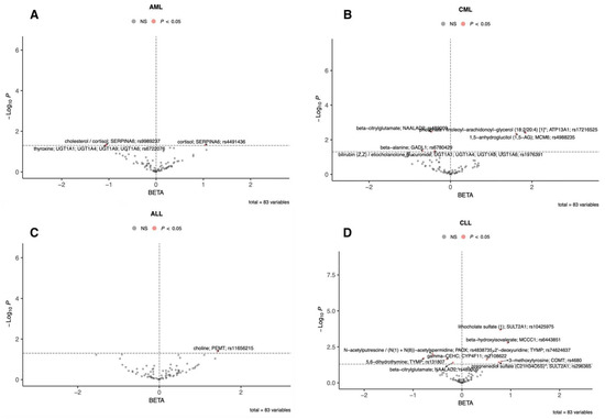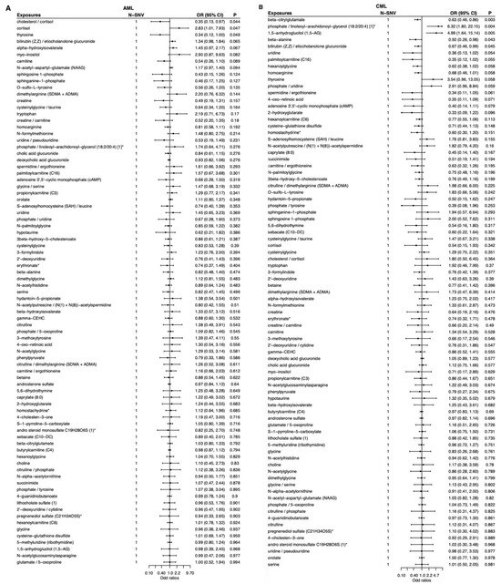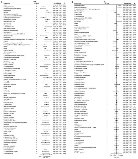 Totally, 83 metabolites and metabolite ratios were analyzed for MR association with AML, CML, ALL, and CLL. The Wald ratio method was used to directly use the effect size estimate of a single SNV to infer the causal relationship between exposure and outcome. After correcting for multiple comparisons, only lithocholate sulfate (1) (rs10425975; SULT2A1) showed a positive association with CLL (OR = 2.19; 95% CI: 1.45–3.31; p = 2 × 10−4). Other metabolite–leukemia pairs were at suggestive level, including cortisol (OR = 2.83; 95% CI: 1.01–7.93; p < 0.05) was positively associated with AML, cholesterol/cortisol (OR = 0.35; 95% CI: 0.13–0.97; p < 0.05) and thyroxine (OR = 0.34; 95% CI: 0.12–1.00; p < 0.05) were negatively associated with AML, phosphate/linoleoyl-arachidonoyl-glycerol (18:2/20:4) [1]* (OR = 6.32; 95% CI: 1.80–22.15; p < 0.01) and 1,5-anhydroglucitol (1,5-AG) (OR = 4.99; 95% CI: 1.64–15.14; p < 0.01) were positively associated with CML, beta-citrylglutamate (OR = 0.63; 95% CI: 0.46–0.86; p < 0.01), beta-alanine (OR = 0.50; 95% CI: 0.26–0.98; p < 0.05), and bilirubin (Z,Z)/etiocholanolone glucuronide (OR = 0.67; 95% CI: 0.46–0.99; p < 0.05) were negatively associated with CML, choline (OR = 4.14; 95% CI: 1.06–16.10; p < 0.05) was positively associated with ALL, beta-hydroxyisovalerate (OR = 2.55; 95% CI: 1.42–4.57; p < 0.01), 2′-deoxyuridine (OR = 1.67; 95% CI: 1.07–2.59; p < 0.05), 3-methoxytyrosine (OR = 2.24; 95% CI: 1.07–4.70; p < 0.05), and pregnenediol sulfate (C21H34O5S)* (OR = 2.13; 95% CI: 1.05–4.33; p < 0.05) were positively associated with CLL, N-acetylputrescine/(N(1) + N(8))-acetylspermidine (OR = 0.55; 95% CI: 0.35–0.87; p < 0.05), 5,6-dihydrothymine (OR = 0.46; 95% CI: 0.24–0.88; p < 0.05), gamma-CEHC (OR = 0.73; 95% CI: 0.56–0.96; p < 0.05), and beta-citrylglutamate (OR = 0.83; 95% CI: 0.70–0.99; p < 0.05) were negatively associated with CLL (Supplementary Table S5, Figure 2).