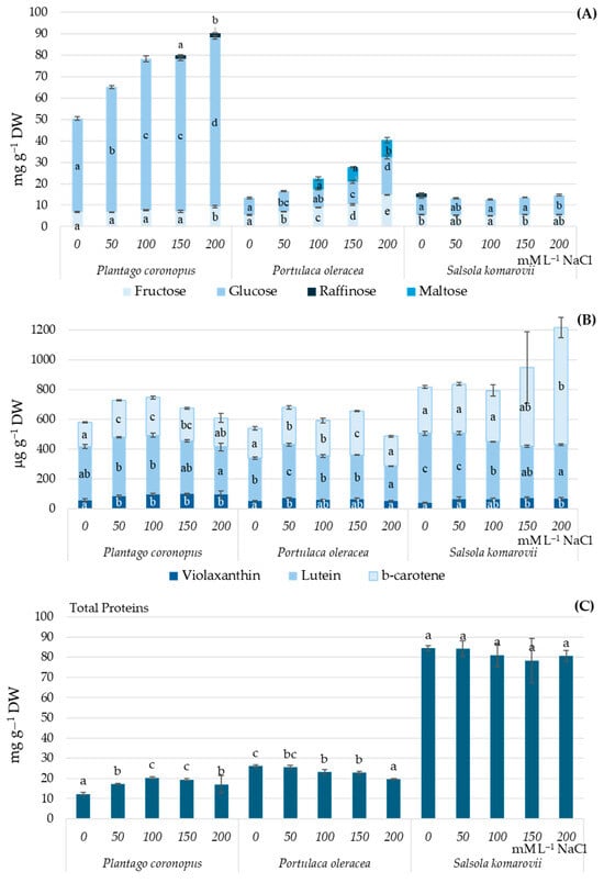 The increasing salinity level of the hydroponic solution led to sugar accumulation in Plantago coronopus and Portulaca oleracea, but had no significant effect on sugar accumulation in Salsola komarovii (Figure 1A). Plantago coronopus accumulated the highest amounts of sugars, particularly due to significant glucose accumulation (43.6–78.8 mg·g−1 DW) (Figure 1A), while Salsola komarovii was noted for the highest protein (78.4–84.5 mg·g−1 DW), lutein (350–470 μg·g−1 DW) and β-carotene (310–787 μg·g−1 DW) content (Figure 1C). As salinity levels of the hydroponic solution increased, there was a significant increase in glucose, up to 2 times, in Plantago coronopus and both fructose (up to 2.7 times) and glucose (up to 2.2 times) in Portulaca oleracea. Furthermore, NaCl concentrations of 150 mM and 200 mM led to the accumulation of raffinose in Plantago coronopus, while concentrations of 100 mM to 200 mM NaCl resulted in maltose accumulation in Portulaca oleracea (Figure 1A). Significantly the lowest total protein content was observed at salinity levels of 0 mM and 200 mM NaCl in Plantago coronopus and Portulaca oleracea, respectively (Figure 1C).