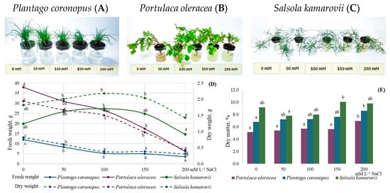 Fresh and dry weight (D), dry matter (E) accumulation in Plantago coronopus (A), Portulaca oleracea (B), and Salsola komarovii (C) shoots, depending on the hydroponic solution salinity (0–200 mM·L−1 NaCl). Different letters indicate statistically significant differences between means of salinity treatments according to one-way ANOVA Tukey’s test when p < 0.05.