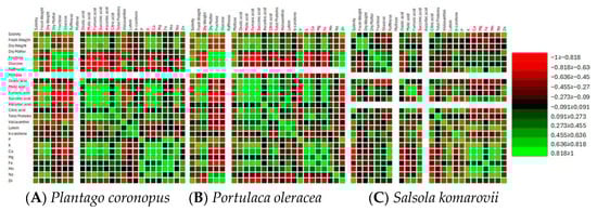 Pearson’s correlation analysis between physiological parameters under different salinity in Plantago coronopus (A), Portulaca oleracea (B), and Salsola komarovii (C). Each cell color is different from 0 with a significance level α = 0.05.