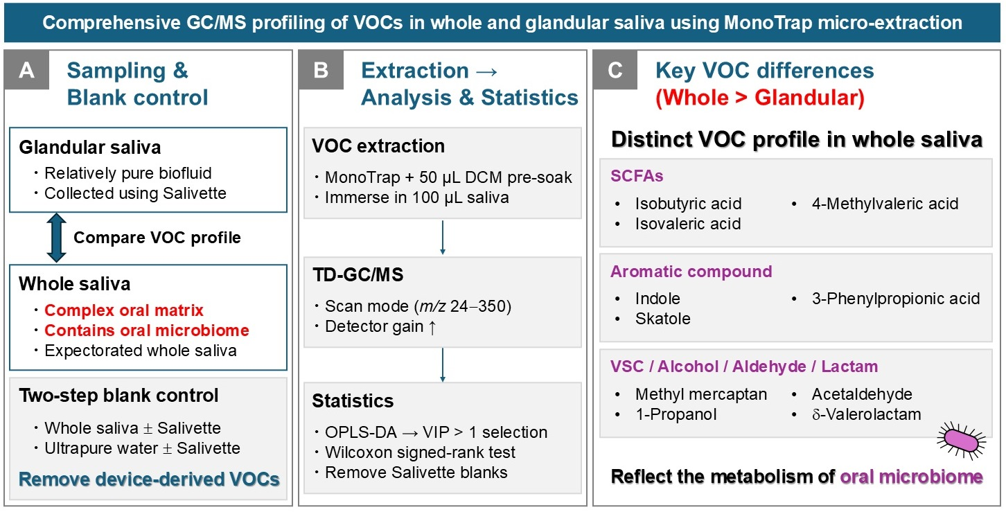 Mori A, Kuboniwa M, Fukusaki E. Comprehensive GC/MS Profiling of Volatile Organic Compounds in Whole and Glandular Saliva Using MonoTrap Micro-Extraction. Metabolites. 2025; 15(11):726. https://doi.org/10.3390/metabo15110726
