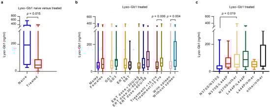 Cross-sectional lyso-Gb1 by sex, Gaucher disease type, DMT type, ERT dose, and duration of treatment at baseline. (a) The naive group showed significantly higher lyso-Gb1 values (median 195 ng/mL, IQR 48.6 to 388) compared with the treated one (median 47.1 ng/mL, IQR 23.1 to 89.7), p = 0.015. (b) In the treated group, significantly higher lyso-Gb1 values were observed in patients treated for more than 15 years (median 62.9 ng/mL, IQR 36.6 to 103) than in patients on DMTs for less than 15 years (median 35.1 ng/mL, IQR 20.3 to 73.9), p = 0.006. Higher lyso-Gb1 levels were also observed in splenectomised patients (median 83.446.1 ng/mL, IQR 34.7 to 224.5) compared with those with an intact spleen (40.746.1 ng/mL, IQR 21.4 to 77.1), p = 0.044. (c) In the treated group, patients with N370S/N370S genotype had significantly lower levels of lyso-Gb1 (median 20.6 ng/mL, IQR, 15.4 to 45) compared with those with N370S/other genotypes (median 52.4 ng/mL (29.6 to 128), p = 0.019. DMT: disease modifying therapy; ERT: enzyme replacement therapy; GD: Gaucher disease; SRT: substrate reduction therapy.