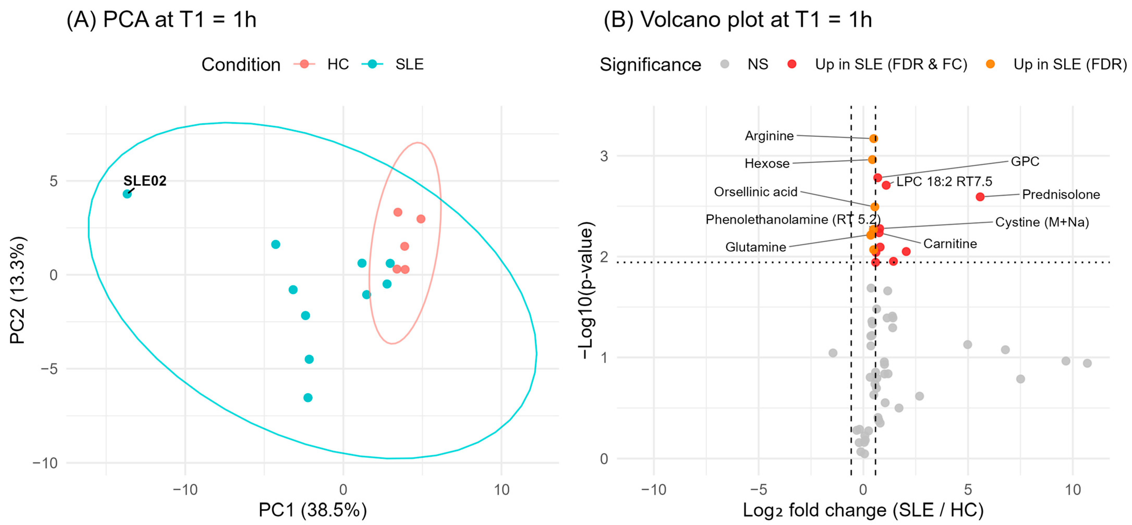 Figure 2. Baseline metabolic differences between SLE patients and HC at T1. (A) Principal component analysis (PCA) of serum metabolite profiles at T1. (B) Volcano plot of SLE vs. HC at T1. Dots represent individual metabolites; features significantly different between groups after FDR correction are shown in orange, with those exhibiting a log2 fold change > 0.58 highlighted in red.
