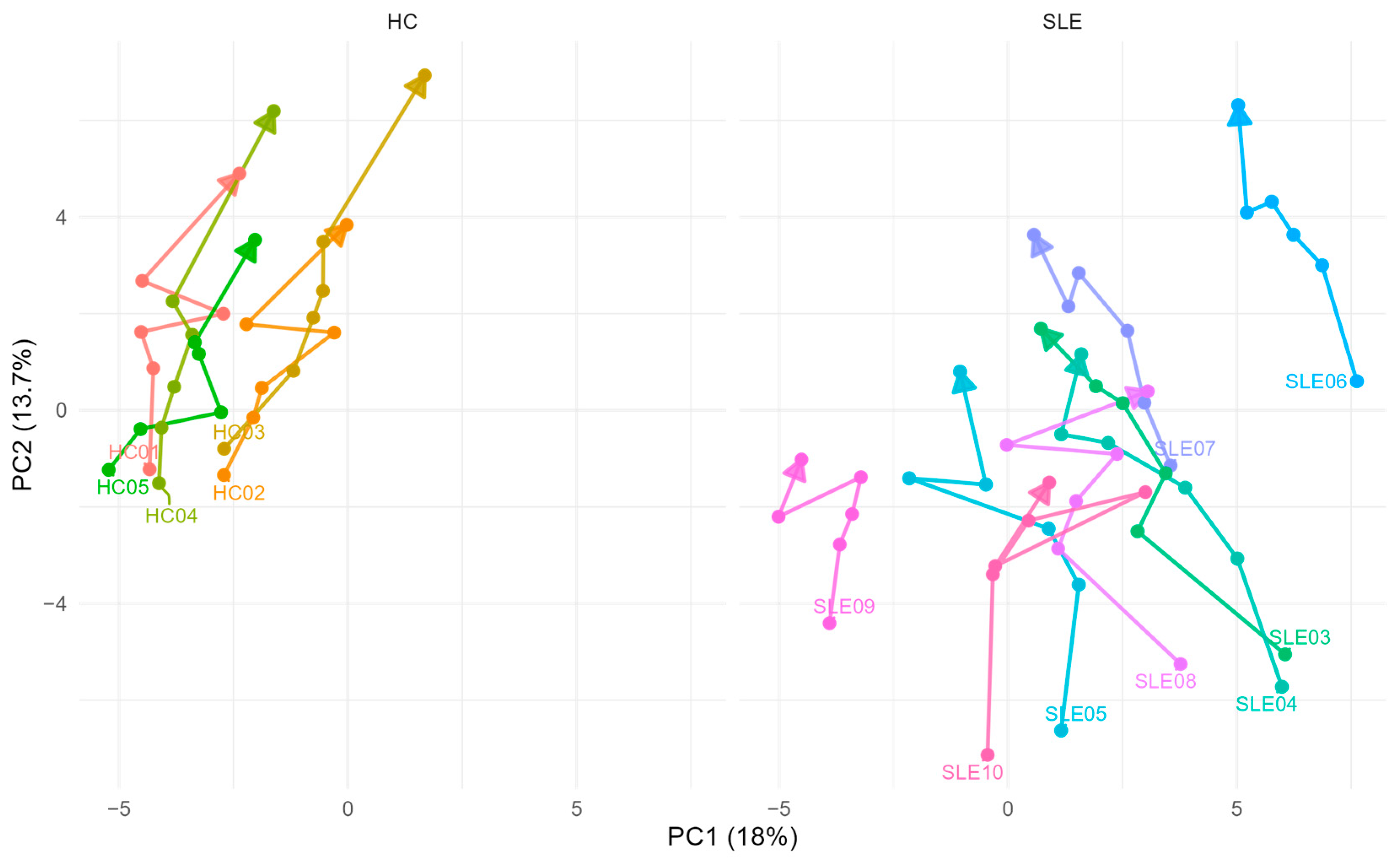 We first investigated ex vivo metabolite stability over time by PCA analysis to visually assess whether temporal movement in multivariate change upon centrifugation delay differs between HC and SLE. Figure 3 displays the updated PCA plot, with scores connected from T = 1 h to T = 24 h for each patient. HC samples exhibited more consistent shifts along PC2, whereas SLE trajectories showed greater dispersion.