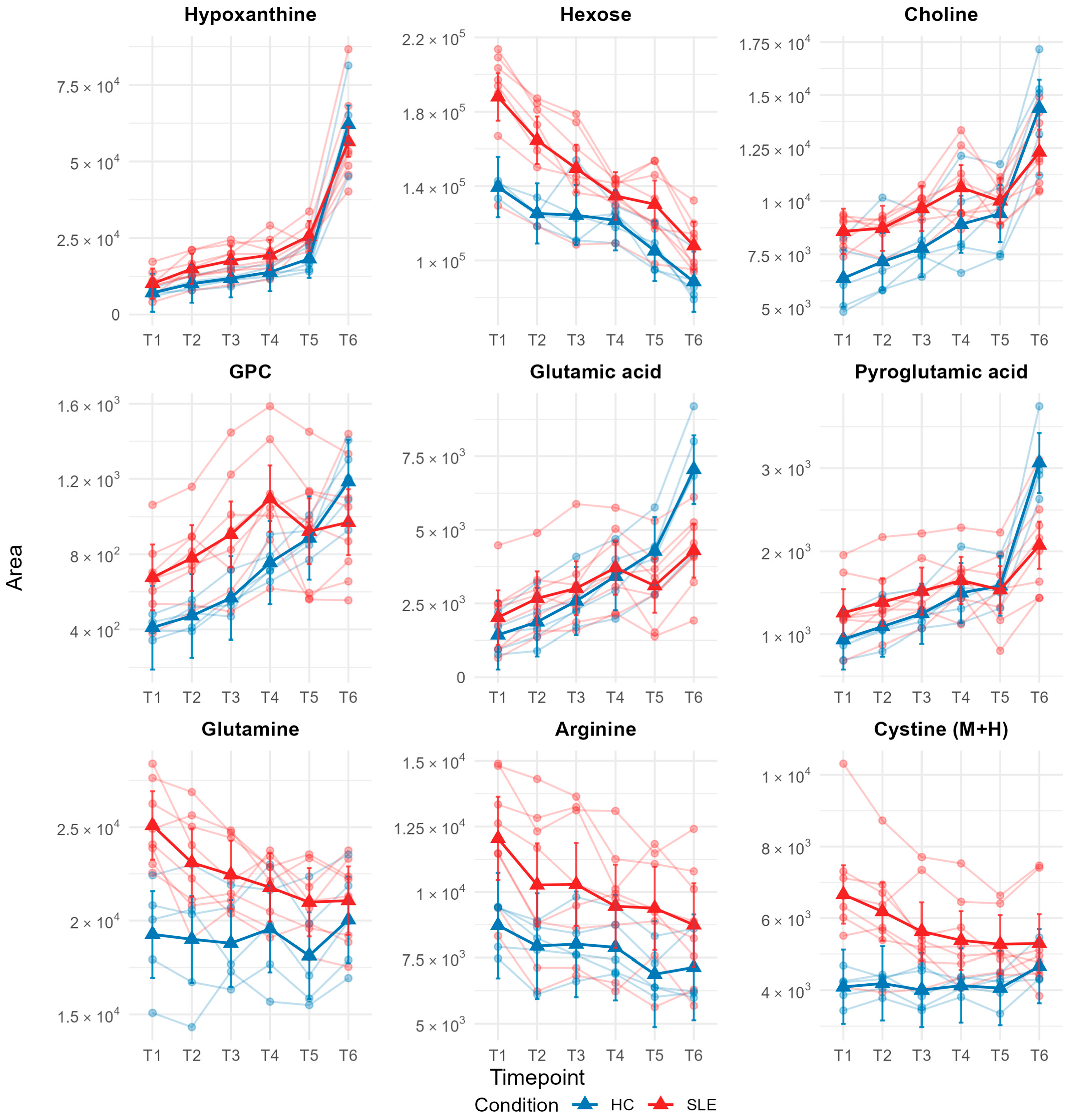 Figure 5. Estimated marginal means (EMMs) over time for selected metabolites (marginal R2 ≥ 0.30) from linear mixed-effects models (blue = healthy controls (HC); red = systemic lupus erythematosus (SLE)). Each panel shows individual trajectories (thin lines) and condition-specific EMMs (solid lines with triangles) with 95% confidence intervals. Y-axes are scaled individually per metabolite.