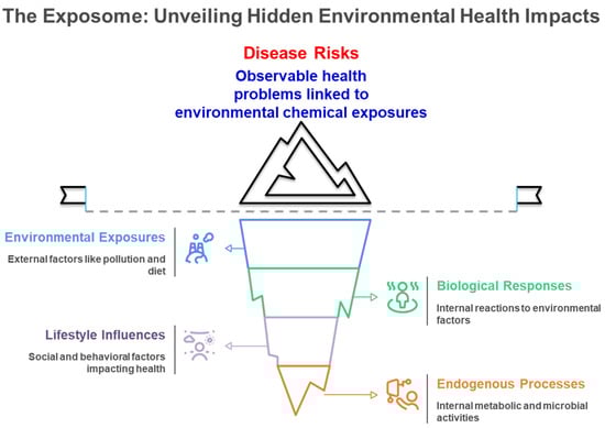 The exposome signifies a transformative approach in environmental health research, including the entirety of environmental exposures experienced by an individual over their lifetime and their significant influence on human health and disease [1,2,3,4,5]. The exposome paradigm was initially proposed by Wild in 2005 [2] and is defined as the aggregate of exposures that individual encounters during their lifetime [1,2,3,4,5,6]. Figure 1 illustrates the comprehensive nature of the exposome paradigm, demonstrating how external environmental exposures, lifestyle influences, and endogenous processes interact to produce biological responses that ultimately manifest as observable disease risks, representing the cumulative environmental influences on human health throughout the lifespan. The chemical exposome covers the totality of environmental chemical exposures experienced by an individual over their lifetime, incorporating both natural and anthropogenic chemicals from external sources—such as inhalation of polluted air, the intake of food compounds and medications, along with the consumption of tainted food and water—as well as internal exposure sources, including metabolic byproducts from gut microbiota (Figure 1) [3,6,7]. Environmental factors significantly influence health status, surpassing the previously acknowledged impact of the intrinsic genome. Factors such as individual food, smoking, and air pollution may account for approximately 46% of global mortality [8,9]. Environmental exposure has emerged as a significant risk factor for public health, correlating with unknown illness risks such as cardiovascular disease, cancer, respiratory disorders, and other chronic conditions [5,6,10]. Figure 2 depicts the varied health consequences of environmental chemical exposures, highlighting the role of the chemical exposome in multiple disease pathways, such as endocrine disruption, developmental disorders, neurological effects, and metabolic dysfunction throughout the human lifespan. These diverse health endpoints reflect the complex toxicological effects of the chemical exposome on human health. This comprehensive understanding of environmental influences has driven the need for more sophisticated analytical approaches capable of capturing the complexity of human chemical exposures.