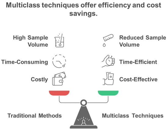 Traditional single-analyte approaches have proven inadequate for comprehensive exposome measurement, leading to the development of innovative multiclass analytical methodologies that can simultaneously quantify diverse chemical classes. Conventional methods for analyzing environmental chemicals have generally concentrated on individual representatives or specific substance classes. Consequently, this focus may lead to the banning of certain chemicals, only to be replaced by less studied analogs that could potentially exhibit similar or even more severe toxicological effects [11]. Methods focusing on a single analyte or class are not suitable for extensive epidemiological studies that require the analysis of thousands of samples, as suggested for upcoming exposome-wide association studies [11]. Most targeted analytical methods quantify fewer than 15 biomarkers of exposure from a singular chemical class within each biospecimen, employing class-specific extractions and instrumental analyses for substances such as dialkyl phosphates (DAPs), EP, herbicides, OPFR, OP pesticides, PAH, PHTH, pyrethroids, tobacco smoke, and VOC [12]. To address these challenges, multi-class techniques are becoming increasingly favored by utilizing extractions that enhance various classes of chemicals in human specimens and enabling simultaneous detection. This approach allows for the measurement of multiple classes of chemicals without the need for separate conventional workflows, ultimately leading to reductions in time, cost, and sample volume [12,13]. Figure 3 illustrates the fundamental advantage of multiclass analytical approaches over traditional single-class methods, demonstrating how simultaneous measurement of diverse chemical classes achieves significant improvements in analytical efficiency, cost-effectiveness, and sample conservation for large-scale exposome studies. Traditional approaches require separate analytical workflows for each chemical class, creating significant bottlenecks in large-scale studies. Multi-class techniques overcome these limitations by enabling simultaneous detection of diverse chemical classes without separate conventional workflows, providing substantial reductions in analysis time, cost, and required sample volumes while maintaining comprehensive chemical coverage. The shift towards multiclass analytical methods has been motivated by the necessity to tackle the intricacies of the exposome, where food-derived metabolites and endogenous compounds typically exist in the millimolar to picomolar concentration range, whereas pollutants may be detected at levels three orders of magnitude lower [14,15]. Recent advancements in analytical instrumentation have accelerated the detection of trace amounts of xenobiotics in human tissues and biofluids, enabling a more accurate quantitative evaluation of an individual’s chemical burden [16]. However, analytical challenges remain, including matrix effects, sensitivity issues, and the need for non-discriminatory sample preparation methods that balance interference reduction with broad chemical coverage [17,18]. The recent technological advancements allow for the concurrent analysis of numerous compounds spanning various chemical classes, transforming the capabilities of exposome research (Table 1). Figure 4 illustrates the comprehensive framework for multiclass assay development in exposomics research, highlighting the integration of targeted and non-targeted approaches while addressing the fundamental challenges posed by chemical diversity in environmental exposure assessment. The framework encompasses both targeted and non-targeted analytical approaches, target selection strategies based on toxicological relevance and exposure prevalence, and the fundamental challenges posed by the vast chemical diversity of environmental contaminants spanning multiple orders of magnitude in physicochemical properties.