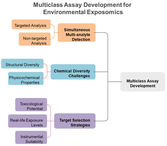 Schematic overview of the key components and challenges in developing multiclass analytical methods for comprehensive exposome characterization.