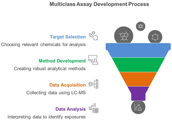 Strategic selection of target analytes requires balancing toxicological relevance, exposure prevalence, analytical feasibility, and representativeness across chemical classes to ensure comprehensive exposome coverage [49,50,51]. The selection of chemicals was informed by their toxicological significance (i.e., is the compound relevant in a health context?), actual exposure levels (i.e., does this compound exist in quantities that can be measured?), compatibility with the instrumental platform (i.e., is retention through reversed-phase LC and ionization via ESI-MS adequate for sensitive analysis?), and being representative for each class of toxicants to ensure comprehensive monitoring of various adverse exposures [49,50]. Target analytes suitable for the multiclass HBM method were chosen according to priority lists of the U.S. Environmental Protection Agency (EPA), EDC-relevant EU legislations on endocrine disruptors, or novel or emerging compounds recently identified in the scientific literature [49,50,52]. The analyte panel was developed from prior research and covered air pollutants, disinfectants and their byproducts, endogenous estrogens, flame retardants, food processing by-products, industrial products, medical drugs, mycotoxins, personal care products, pesticides, phytoestrogens, phytotoxins, plastic-related chemicals, and PFAS compounds [11,50,53,54]. A multiclass targeted analyte list was established beforehand to direct method development, with the choice of anthropogenic contaminants, natural dietary substances, and tobacco markers limited to substances that are regularly tracked in human serum or urine by the US National Health and Nutrition Examination Survey (NHANES) and European HBM4EU priority substances [41,49,50]. The choice of target analytes and analyte classes aimed to be as extensive as technically possible, encompassing various structures, everyday life exposure levels, and toxicological pathways of action [41,51,54]. These systematic selection criteria ensure that multiclass methods capture the most toxicologically relevant and prevalent exposures while maintaining analytical feasibility for large-scale studies (Figure 4) [49,50,51].