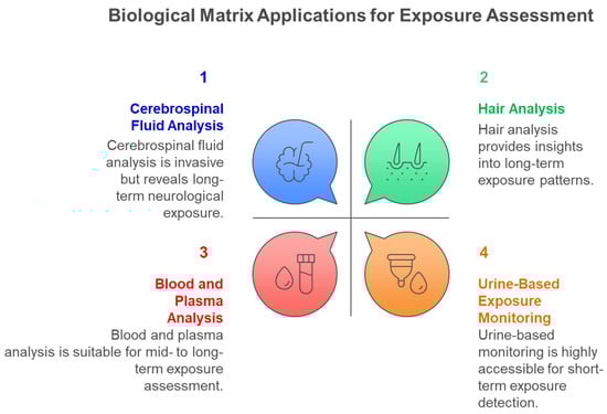 Cerebrospinal fluid analysis represents a specialized application for assessing chemical exposure to the central nervous system, providing direct evidence of blood–brain barrier penetration and potential neurological effects of environmental contaminants [132,133]. Cerebrospinal fluid is the most proximate biological fluid to the brain, with anomalies in this matrix directly correlating to pathological alterations in the brain (Figure 6) [36]. Notwithstanding its biological importance, the quantity of metabolomics/exposomics studies conducted on cerebrospinal fluid (CSF) samples is limited due to the invasive and valuable nature of the sample (necessitating lumbar puncture) coupled with methodological obstacles, such as the absence of standardized materials and the fairly low levels of chemicals in CSF relative to other matrices like blood [36]. The 28 pollutants analyzed displayed median values varying from the LOD to 10.5 ng/mL in blood and from LOD to 1.2 ng/mL in CSF. Four PFAS compounds were found in at least 60% of cerebrospinal fluid samples (n ≥ 108), namely perfluorobutanesulfonic acid (PFBS), perfluorooctanoic acid (PFOA), 6:2 chlorinated polyfluoroalkyl ether sulfonate (6:2 Cl-PFESA), and perfluorohexanesulfonic acid (PFHxS), with median concentrations varying from 0.001 to 0.042 ng/mL [36]. Research indicates that several environmental pollutants can penetrate the blood- brain barrier into the brain’s central nervous system (CNS), thereby impairing neuronal development and functions (Figure 2) [36]. CSF analysis provides critical insights into central nervous system exposure to environmental chemicals and demonstrates that molecular size is a key determinant of blood–brain barrier penetration, with important implications for neurotoxicity assessment [132,133].