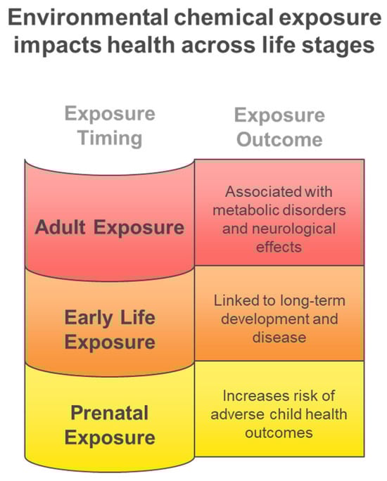 Pediatric population studies using urine-based exposure monitoring reveal unique exposure patterns in children and highlight the vulnerability of early life stages to environmental chemical exposures [32,119,120,121]. This research utilized the nationwide Environmental Impacts on Child Health Outcomes (ECHO) Cohort to evaluate chemical exposures in 201 children aged 2 to 4 years from 2010 to 2021 [32]. A total of 111 analytes from various chemical classes were concurrently measured in individual spot urinary specimens obtained from all children and their mother during pregnancy, with concentrations assessed between kid and prenatal maternal samples [32]. Of the 111 chemicals, 96 were identified in a minimum of five children, whereas 48 analytes were present in more than 50% of the children [32]. Thirty-four substances were universally identified (>90%), nine of which are absent from the United States national biomonitoring: triethyl phosphate, benzophenone-1, and six phthalate metabolites together with one alternative plasticizer [32]. After having demonstrated the feasibility of urine collection at this young age group, NHANES recently expanded its protocols to include the collection of urine specimens from children aged 3–5 years, beginning with the 2015–2016 survey period, for the measurement of nonpersistent chemical biomarkers [32]. These pediatric studies demonstrate widespread exposure to environmental chemicals in young children [32,119,121] and identify emerging contaminants not previously monitored in national surveillance programs [32].