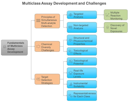 This narrative review provides a comprehensive examination of multiclass assays for measuring environmental chemical mixture exposure, with particular focus on analytical methodologies that enable simultaneous quantification of diverse chemical classes in biological matrices [12,14,40]. This narrative review examines the development and application of multiclass assays for environmental chemical exposure measurement, focusing on analytical methodologies that enable simultaneous quantification of diverse chemical classes [41,42]. The scope encompasses mass spectrometry platforms, sample preparation strategies, and validation approaches for comprehensive exposure measurement in human biomonitoring studies, with particular emphasis on the technical challenges and solutions for analyzing complex chemical mixtures in biological matrices [40,41,43]. This review highlights the necessity for thorough analytical methods that include all significant environmental chemical classes in biological matrices to facilitate accurate exposure and risk evaluation [41,42,44]. Table 1 provides a comprehensive overview of recent multiclass analytical studies for environmental chemical exposure measurement, summarizing study designs, analytical platforms, target analyte numbers, and primary research objectives across diverse human biomonitoring applications. The methodology facilitates, for the first time, the concurrent characterization of the food-derived metabolites, endogenous metabolome, medicines, environmental contaminants, home chemicals, and microbial derivatives, encompassing over 1000 metabolites in total [14]. The distinction between exposomics and metabolomics is critical for understanding the scope of multiclass analytical approaches. While metabolomics focuses on comprehensive measurement of endogenous metabolites and biological responses, exposomics specifically targets environmental chemical exposures and their biomarkers throughout the human lifespan. The novel exposomics methodology complements metabolomics techniques and is scalable to facilitate extensive exposome research. Through systematic evaluation of current methodologies and their applications, this review aims to guide future developments in exposome-scale analytical approaches and their implementation in large-scale epidemiological studies (Table 1) [12,14,41].