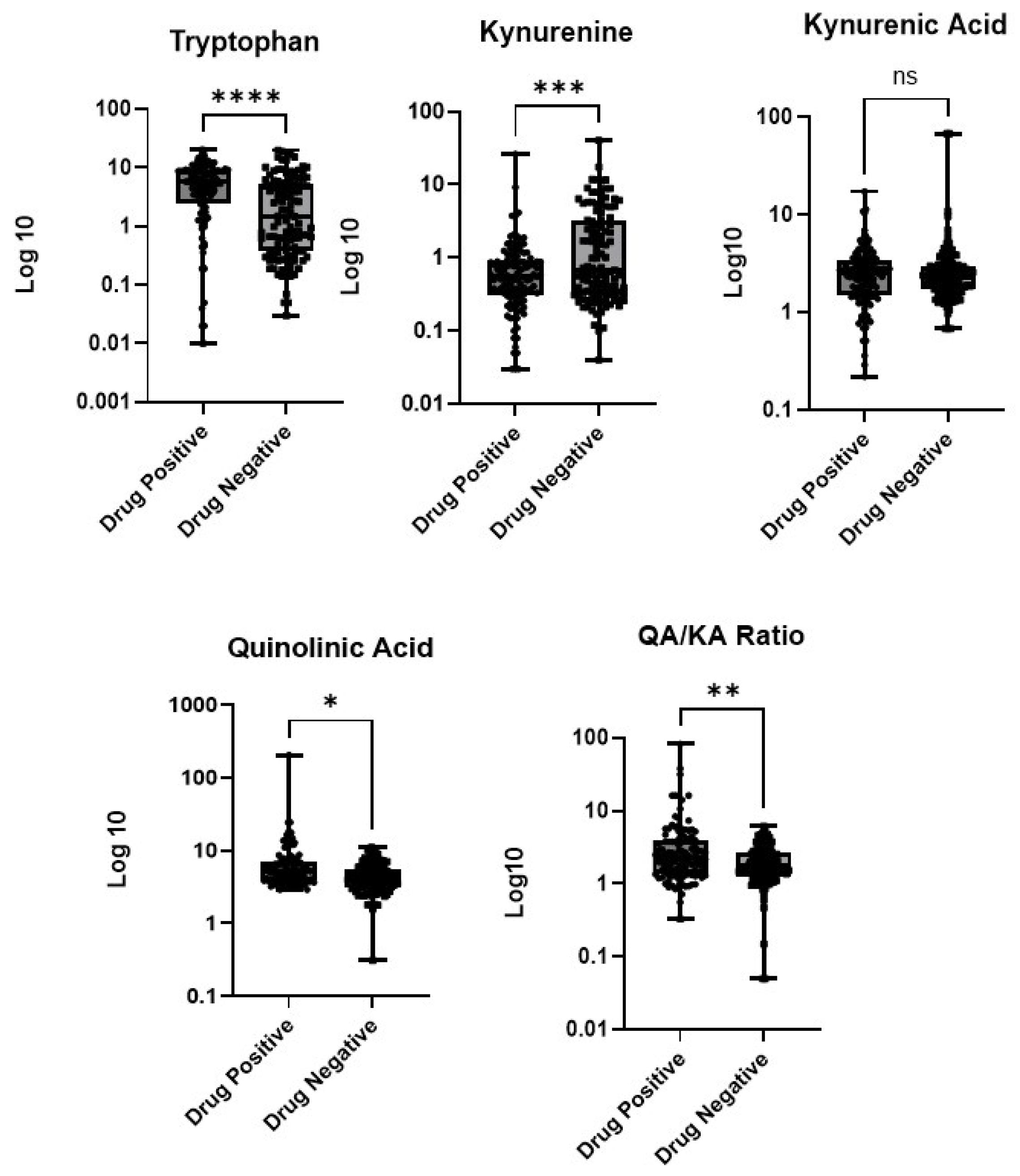 LC-MS/MS Detection of Tryptophan, Kynurenine, Kynurenic Acid, and Quinolinic Acid in Urine Samples from Drug-Positive and Illicit Drug-Negative Patients with a Known History of Substance Use Disorder