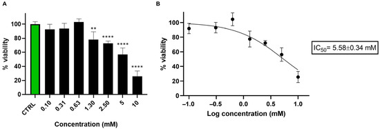 Cell viability was calculated as the percentage of viable cells relative to untreated control. Data are presented as mean ± standard deviation (SD) from three independent experiments. Statistical analysis was performed using one-way ANOVA followed by Dunnett’s multiple comparisons test, using GraphPad Prism version 8.0 (GraphPad Software, San Diego, CA, USA). Statistical significance was set at p < 0.05. Asterisks indicate significance levels compared to untreated cells (CTRL): p < 0.01 (**), and p < 0.0001 (****). IC50 was calculated using GraphPad Prism 8.0 software by nonlinear regression of dose–response inhibition.