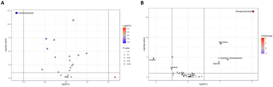Sample data were normalized using the sum, then log-transformed and Pareto scaled, and analyzed with the MixOmics R package (mixOmics package, ver 6.28.0, University of Melbourne Australia, Melbourne, Victoria, Australia) and Metaboanalyst 6.0 (University of Alberta, Edmonton, Alberta (AB), Canada) [33,34]. Univariate analysis was performed separately on the exometabolome and endometabolome of the groups, using T-test and Fold Change, and results were displayed in a Volcano plot [35].