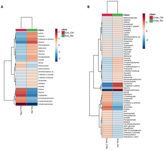 As shown in the Volcano plot in Figure 3A, the extracellular medium of SH-SY5Y cells treated with nicotine exhibits a lower concentration of 3-hydroxybutyrate. On the other hand, the intracellular compartment (Figure 3B) reports higher concentrations of glycine, L-aspartyl-phenylalanine, sarcosine, and phosphorylcholine (PC), while lower concentrations of lactose and proline. A comprehensive overview of the relative concentrations of all metabolites is in the heatmaps presented in Figure 4A,B.