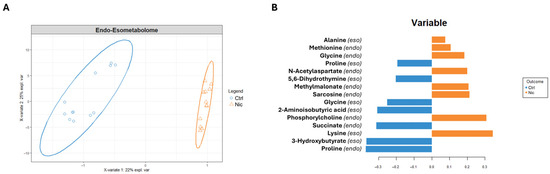 (A) sPLS-DA score scatter plots related to the metabolomic profile of combined cellular compartments of SH-SY5Y treated with nicotine for 24 h (Nic) vs. control cells (Ctrl). The cluster analyses are reported in the Cartesian space described by the principal components PC1:22% and PC2:25%. sPLS-DA was evaluated using cross-validation (CV) analysis. CV tests performed according to the sPLS-DA statistical protocol show a significant cluster separation (0.98 and 0.79 accuracy values on PC1 and PC2, with positive 0.58 and 0.55 Q2 indices, respectively). (B) Loadings bar plot related to the combined matrices of endometabolome and exometabolome. The variables responsible for metabolomic profile differences are ordered according to values of increasing importance from bottom to top. Colors indicate the cluster where the median is maximum for each metabolite (orange: nicotine; blue: Control).