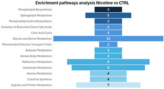 Consistent with a significant increase in phosphorylcholine concentration, enrichment analysis reveals an effect on biochemical pathways related to phospholipid biosynthesis, specifically sphingolipid biosynthesis and phosphatidylcholine biosynthesis, highlighting a role of nicotine in inducing important lipid remodeling, modifying cell lipid metabolism, and cell membrane structure. On the other hand, evident effects are observable in amino acid metabolism (methionine, arginine, and proline metabolism; glycine and serine metabolism; glutamate and alanine metabolism) and mitochondrial activity, particularly in the mitochondrial electron transport chain, oxidation of branched-chain fatty acids, and citric acid metabolism.