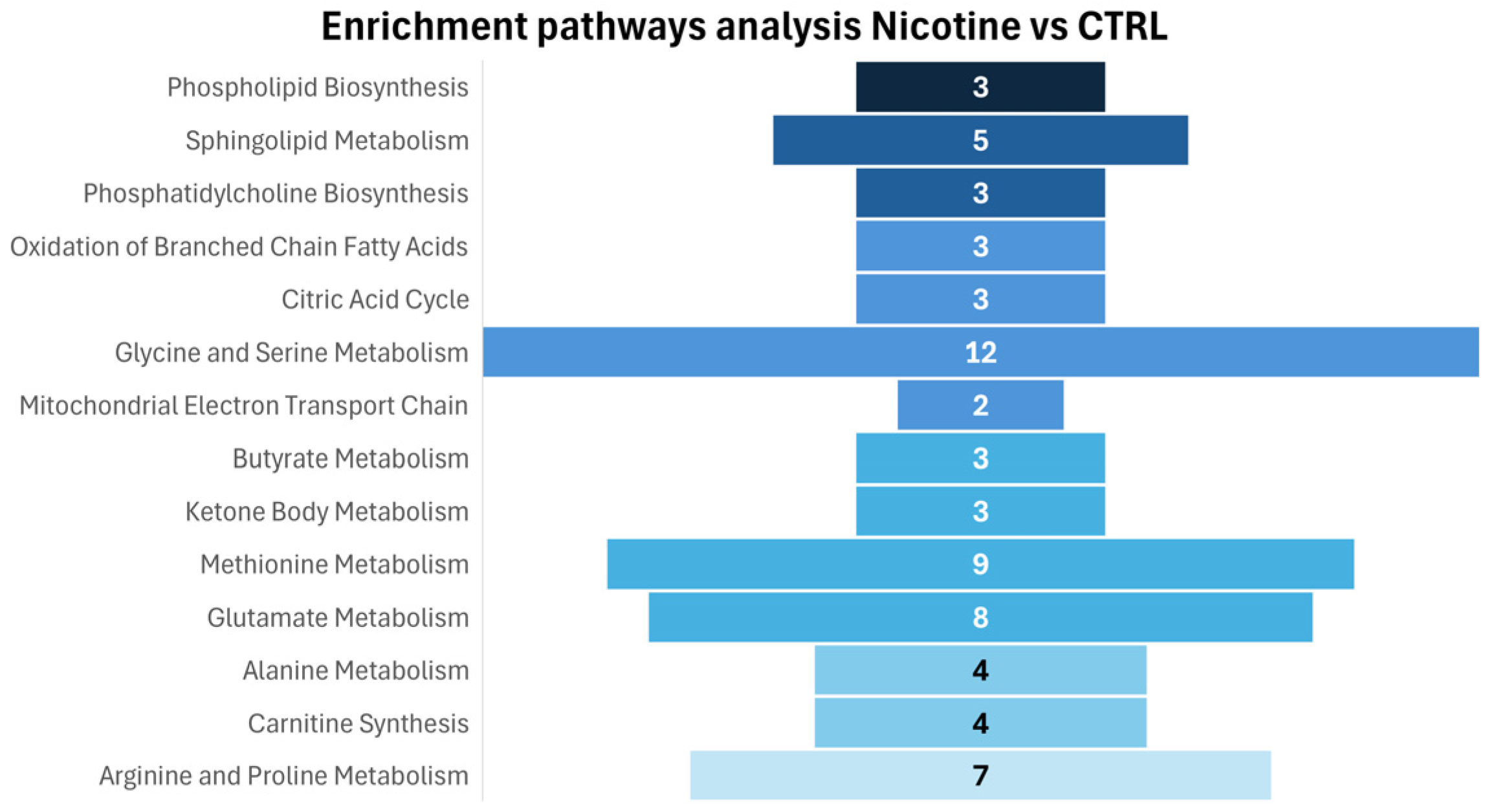 - Regulation of membrane dynamics and plasticity. Nicotine treatment increases intracellular phosphorylcholine (PC) and modulates pathways related to phospholipid and sphingolipid metabolism. These alterations suggest enhanced membrane remodeling and synaptic plasticity, potentially contributing to nicotine’s cognitive effects.