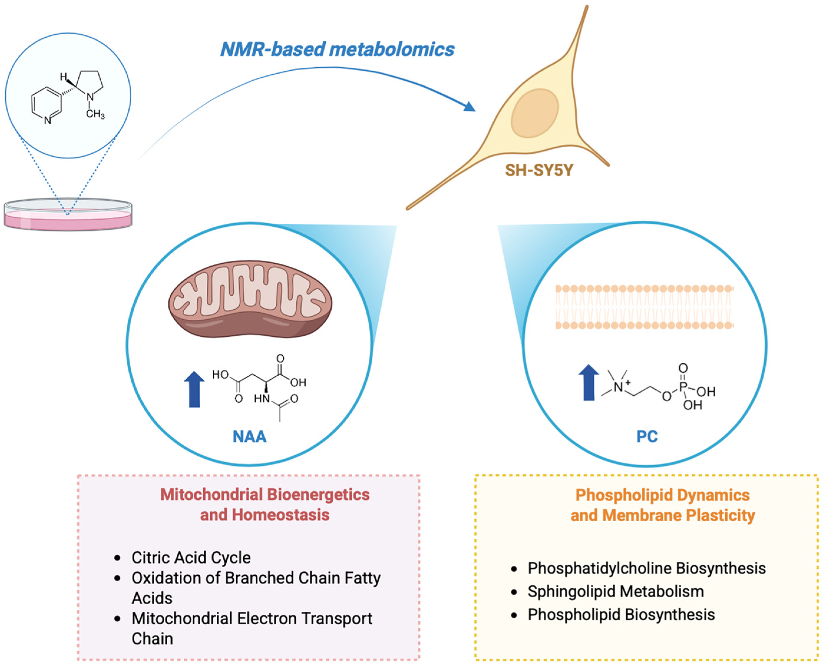 - Modulation of mitochondrial bioenergetics and homeostasis. Nicotine influences key mitochondrial pathways and elevates N-acetylaspartate (NAA) levels, supporting improved mitochondrial activity and neuronal viability. These findings align with previous evidence and highlight mitochondria as a central target of nicotine’s cellular mechanism of action.