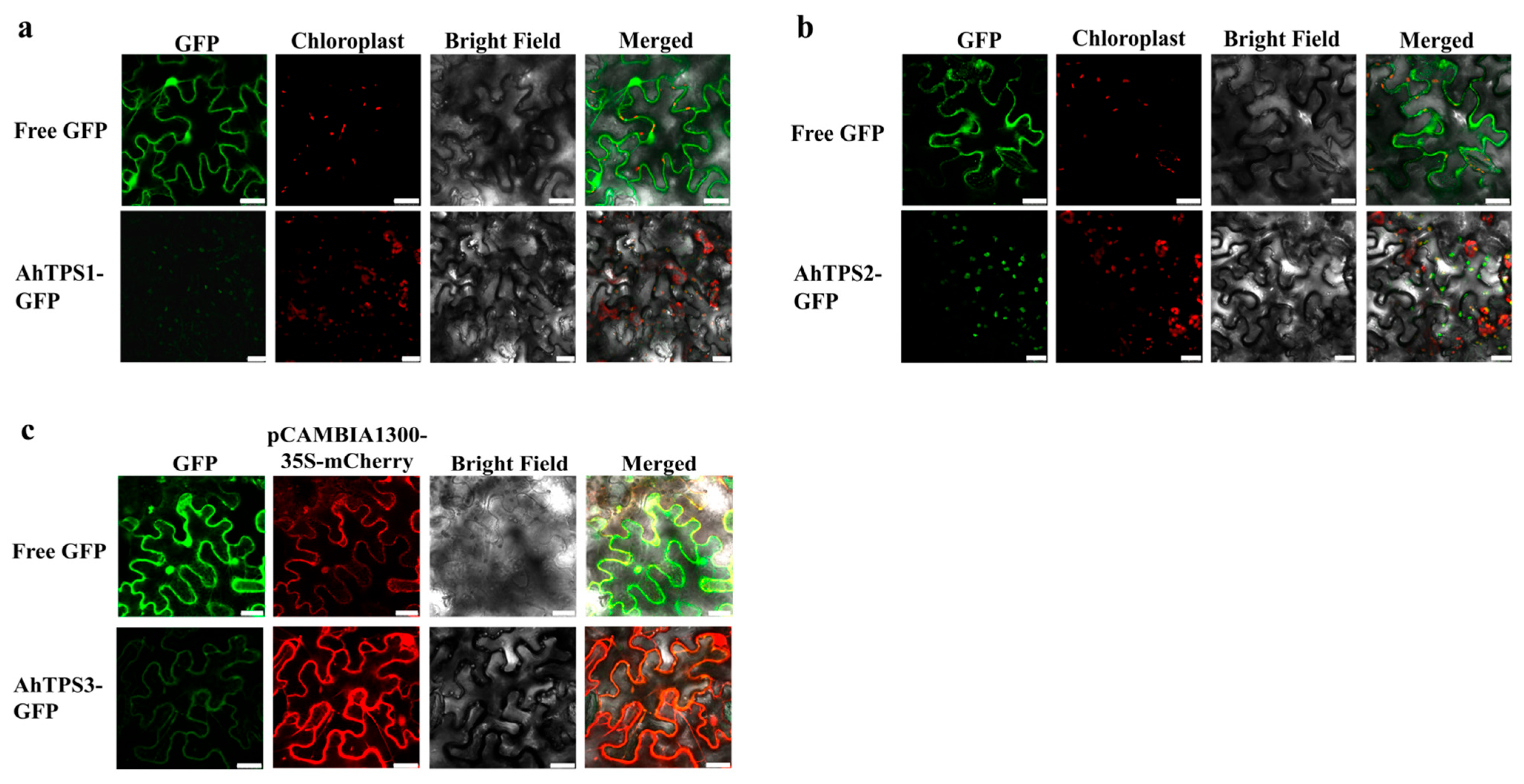 3.5. Subcellular Localization of AhTPS1, AhTPS2, and AhTPS3