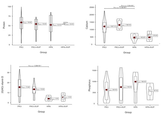 Total nutrient intakes in the study groups (PKU, PKU with supplementation [PKU + SUP], HPA, and HPA with supplementation [HPA + SUP]). Violin plots display the distribution of intakes for protein (top left, 0 = 0.831), calcium (top right, p = 0.052), 25(OH) vitamin D (bottom left, p = 0.001), and phosphorus (bottom right, p = 0.713). Red dots indicate the median values, with boxes showing the interquartile range. p-values refer to pairwise group comparisons.