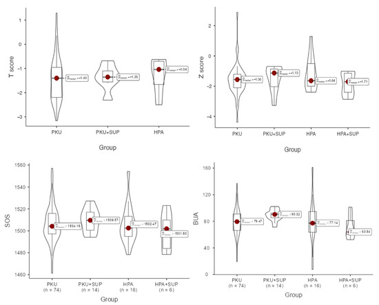 Distributions of all the available QUS output values are reported in Table 4. BQI was higher in the PKU supplemented group, although without significant difference compared to other groups. BUA was significantly higher in the above group (p = 0.040), whereas it showed the lowest levels in the HPA-supplemented group. Z-score reached the highest levels in HPA children, and the T-score in PKU-supplemented adults.