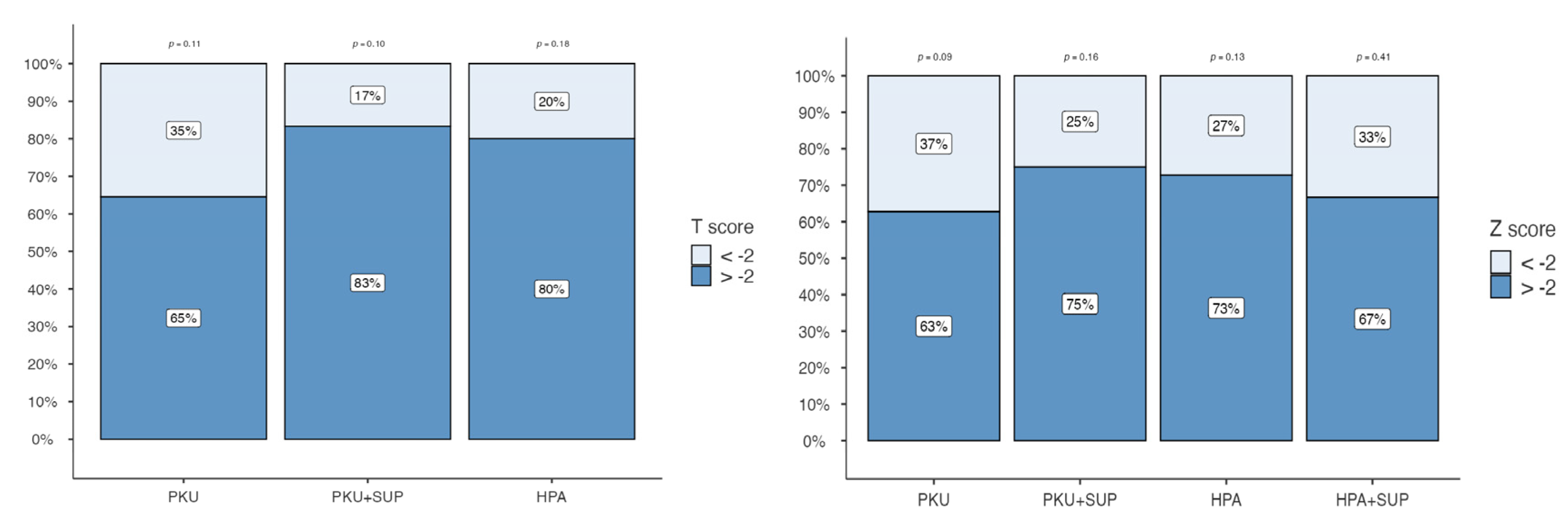 In adult patients, when applying the <−2 threshold, the prevalence of PKU patients falling below this cut-off level was 35% (n = 11). In contrast, only 17% of PKU + SUP and 20% of HPA adult patients presented T-score levels below −2. No HPA patients supplemented with vitamin D had a T-score level under −2.