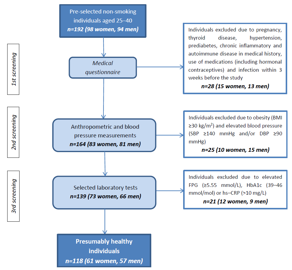 | Abdominal obesity (WC ≥ 80/≥94 cm, F/M) | 3.217 (1.409–7.348) | 0.006 | 1.518 (0.549–4.192) | 0.421 | 1.274 (0.452–3.590) | 0.647 |
