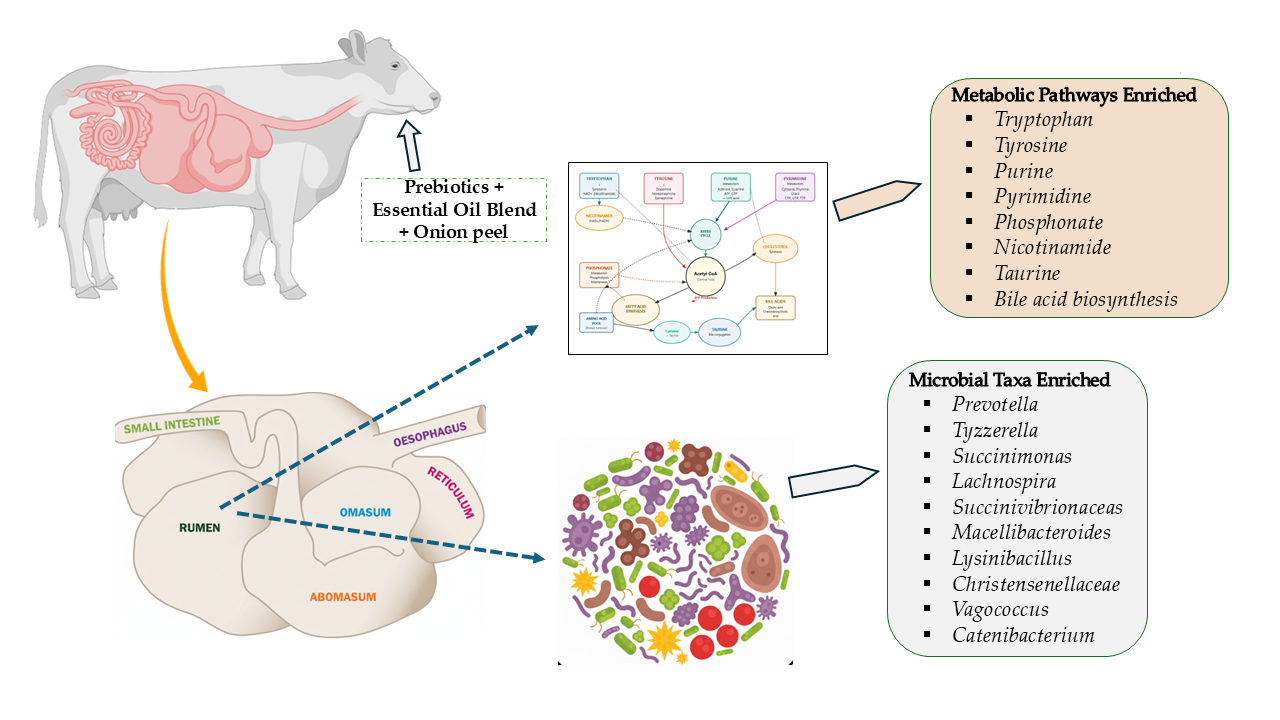Alabi, J.O.; Kholif, A.E.; Ike, K.A.; Okedoyin, D.O.; Adelusi, O.O.; Wuaku, M.; Anotaenwere, C.C.; Enikuomehin, J.M.; Oderinwale, O.A.; Adebayo, J.O.; et al. Rumen Fluid Metabolomics and Microbiome Profiling of Dairy Cows Fed Combinations of Prebiotics, Essential Oil Blend, and Onion Peel Using the RUSITEC System. Metabolites 2025, 15, 762. https://doi.org/10.3390/metabo15120762
