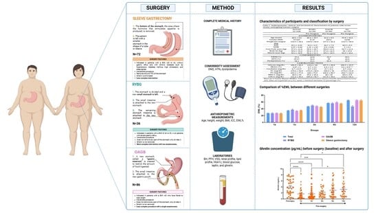 - Askarpour, M.; Alizadeh, S.; Hadi, A.; Symonds, M.E.; Miraghajani, M.; Sheikhi, A.; Ghaedi, E. Effect of Bariatric Surgery on Serum Inflammatory Factors of Obese Patients: A Systematic Review and Meta-Analysis. Obes. Surg. 2019, 29, 2631–2647. [Google Scholar] [CrossRef]