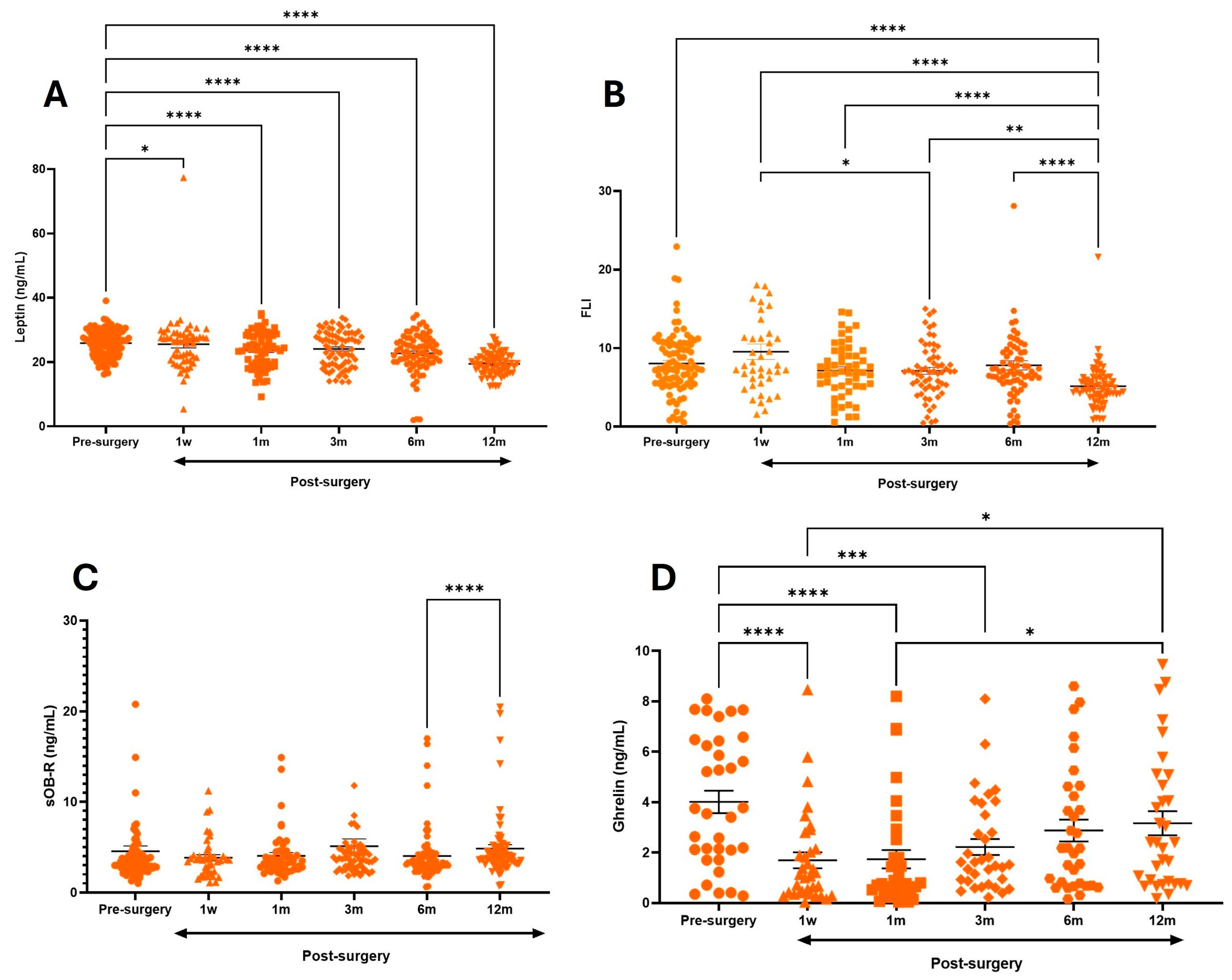 APA StyleBasurto, L., Basurto-Acevedo, N., Oviedo, N., Santa Cruz-Galicia, E., Rodríguez-Martínez, A. I., Tesoro-Cruz, E., Martínez-Murillo, C., García-Estrada, A. G., Nájera Meneses, A. C., & Manuel-Apolinar, L. (2025). Effect of Metabolic and Bariatric Surgery Associated with Changes in Weight Loss, Free Leptin Index, and Soluble Leptin Receptor. Metabolites, 15(12), 764. https://doi.org/10.3390/metabo15120764