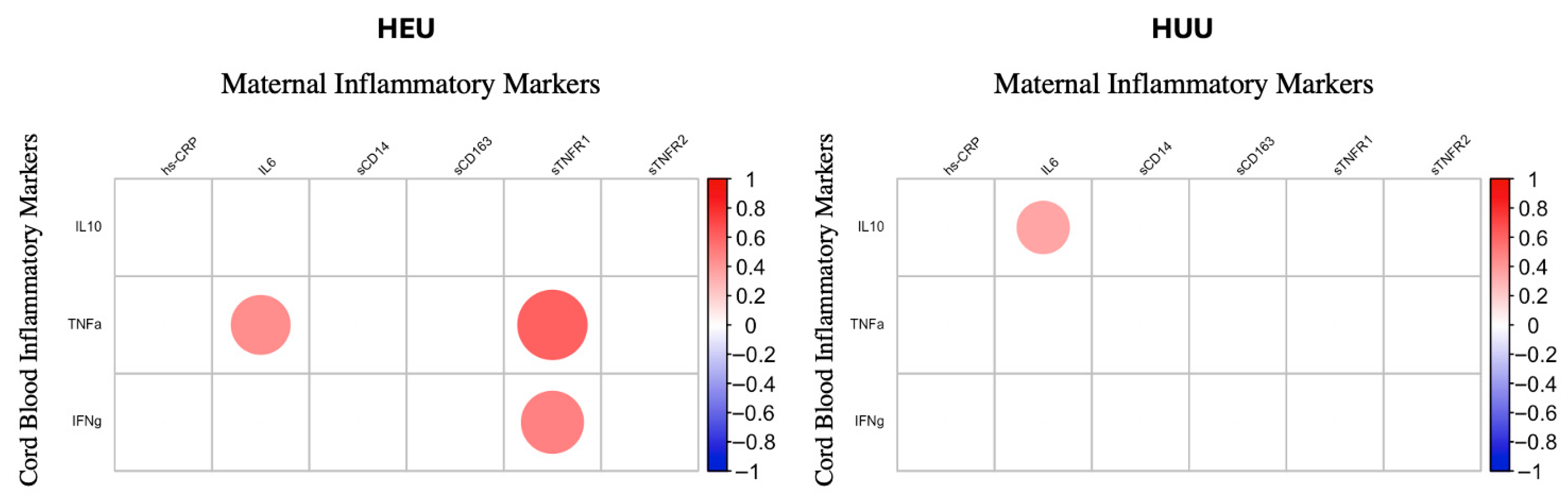 Figure 1. Relationships between maternal inflammatory markers and cord blood inflammatory markers by HIV exposure status. The heat map displays Spearman correlations (where rho is >0.2) between maternal inflammatory markers and cord blood metabolic-related cytokines by HIV exposure status. Circle color corresponds to correlation value. Circle size corresponds to p-value. A larger circle indicates a smaller p-value. Abbreviations—HEU: HIV-exposed uninfected; HUU: HIV-unexposed uninfected; IL: interleukin; hs-CRP: high-sensitivity C-reactive protein; sTNFR: soluble TNF-α receptor; sCD14: soluble CD14; sCD163: soluble CD163; TNFα: tumor necrosis factor alpha; IFN-γ: interferon gamma.
