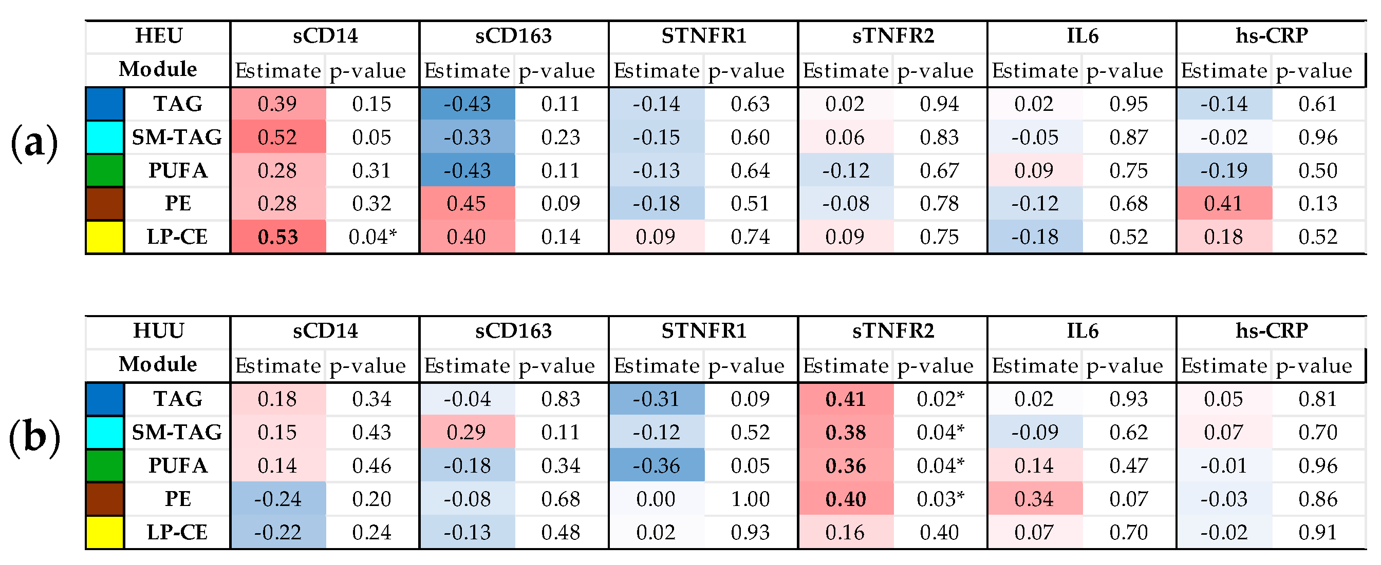 Figure 3. Partial Pearson correlation coefficients between maternal markers of inflammation and immune activation and cord blood metabolite/lipid networks adjusted for maternal age and fetal sex. (a) Association for HEU (HIV-exposed uninfected). (b) Association for HUU (HIV-unexposed uninfected). Darker red indicates a stronger positive correlation; darker blue indicates a stronger negative correlation. Bold p-value < 0.05. Abbreviations—HEU: HIV-exposed uninfected; HUU: HIV-unexposed uninfected; IL: interleukin; hs-CRP: high-sensitivity C-reactive protein; IFN-γ: interferon gamma; LP-CE: lysophospholipid and cholesteryl ester; PE: phosphatidylethanolamine; PUFA: polyunsaturated triacylglycerol; TNFR: soluble TNF-α receptor; sCD14: soluble CD14; sCD163: soluble CD163; TNFα: tumor necrosis factor alpha; TAG: triacylglycerol, SM-TAG: saturated and monosaturated TAG. * p-value < 0.05.