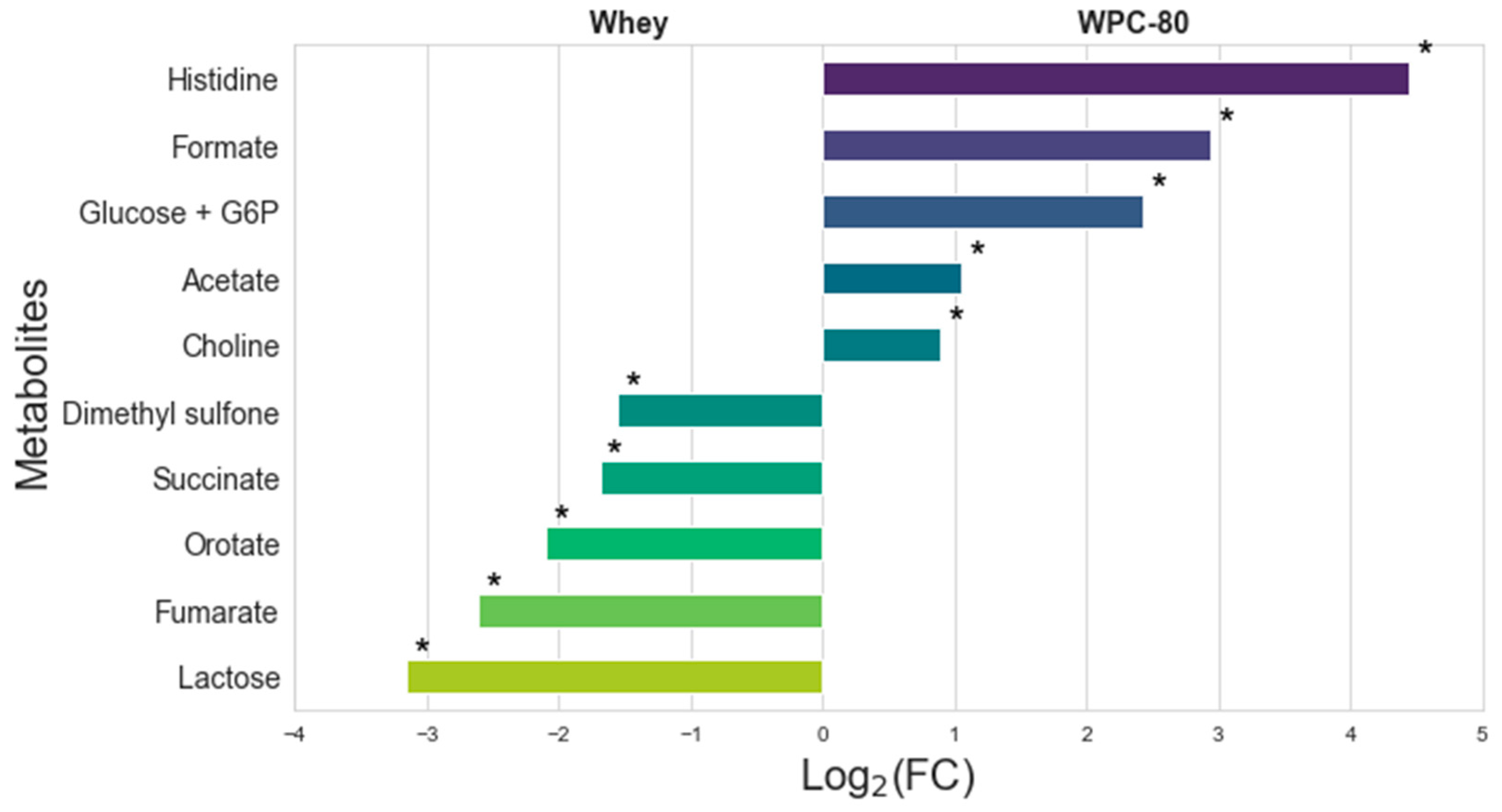 4.1. Differences in Metabolite Abundance Between Whey and WPC-80