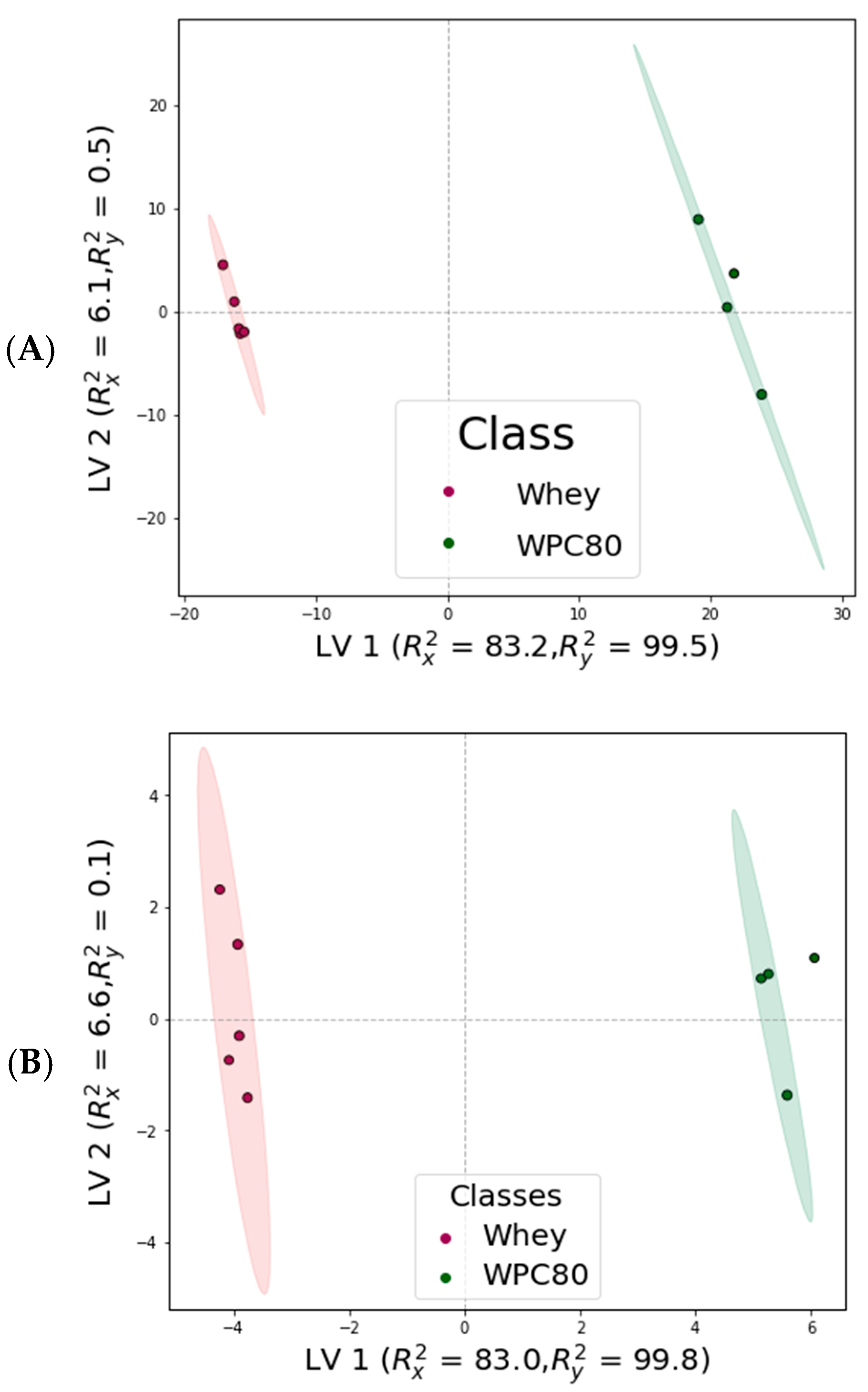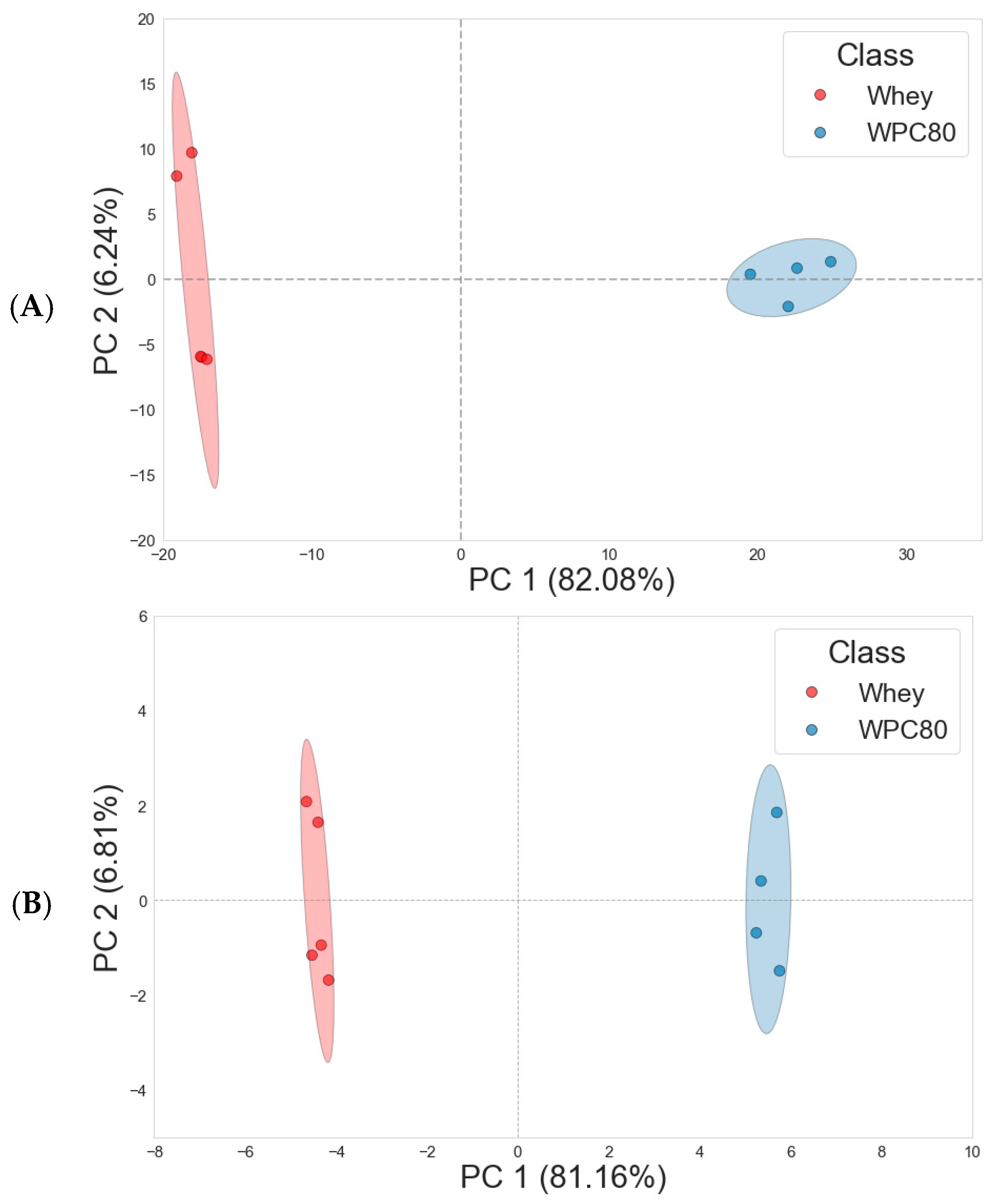 4.2. PCA-Based Clustering and Key Metabolites Identified by PLS-DA in Whey and WPC-80