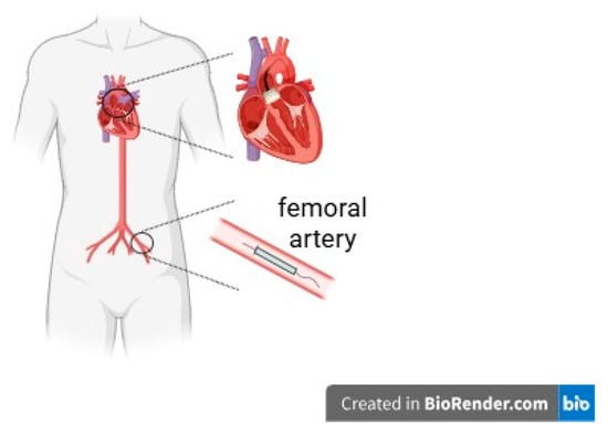 In untreated symptomatic severe AS, the annual risk of death is approximately 25%, although it varies depending on the AS subtype []. Currently, there is no pharmacological treatment available for severe AS or the concomitant HF; the only treatment option remains aortic valve replacement (AVR) []. A rapidly developing minimally invasive treatment method for severe AS is transcatheter aortic valve implantation (TAVI) (Figure 1). TAVI has become more widespread and is now the preferred treatment option for elderly patients with severe symptomatic AS, regardless of whether they are at high, moderate or even low surgical risk. Compared to surgical aortic valve replacement (SAVR), TAVI offers advantages like minimized hospital stay durations, enhanced recovery efficiency and prompt resumption of routine activities. TAVI significantly improves hemodynamic parameters, including reducing the transvalvular gradient below 20 mmHg and increasing the valve orifice area to 1.5–2.0 cm []. According to CoreValve studies, the one-year survival rate for high-risk patients with severe AS undergoing TAVI was higher than for those who had undergone SAVR []. The 5-year follow-up of this cohort demonstrated comparable mid-term survival rates between the two methods [].