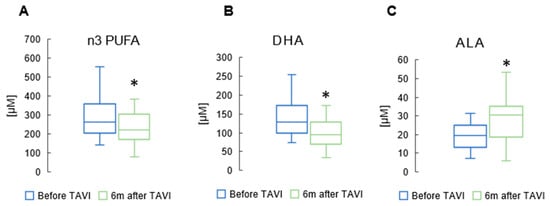 Concentration of total n3 polyunsaturated fatty acids (n3 PUFAs) (A); docosahexaenoic acid (DHA) (B); and alpha-linolenic acid (ALA) (C) in serum of patients after TAVI. * p < 0.05 for paired Student t-test.