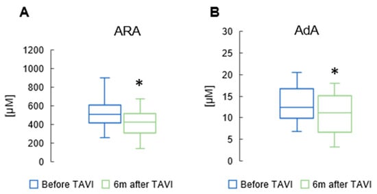 Change in concentrations of arachidonic acid (ARA) (A), and adrenic acid (AdA) (B) in the serum of patients 6 m after TAVI. * p < 0.05 for paired Student t-test.